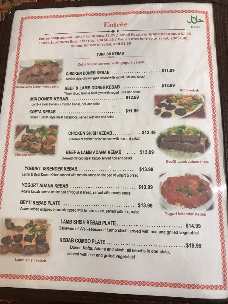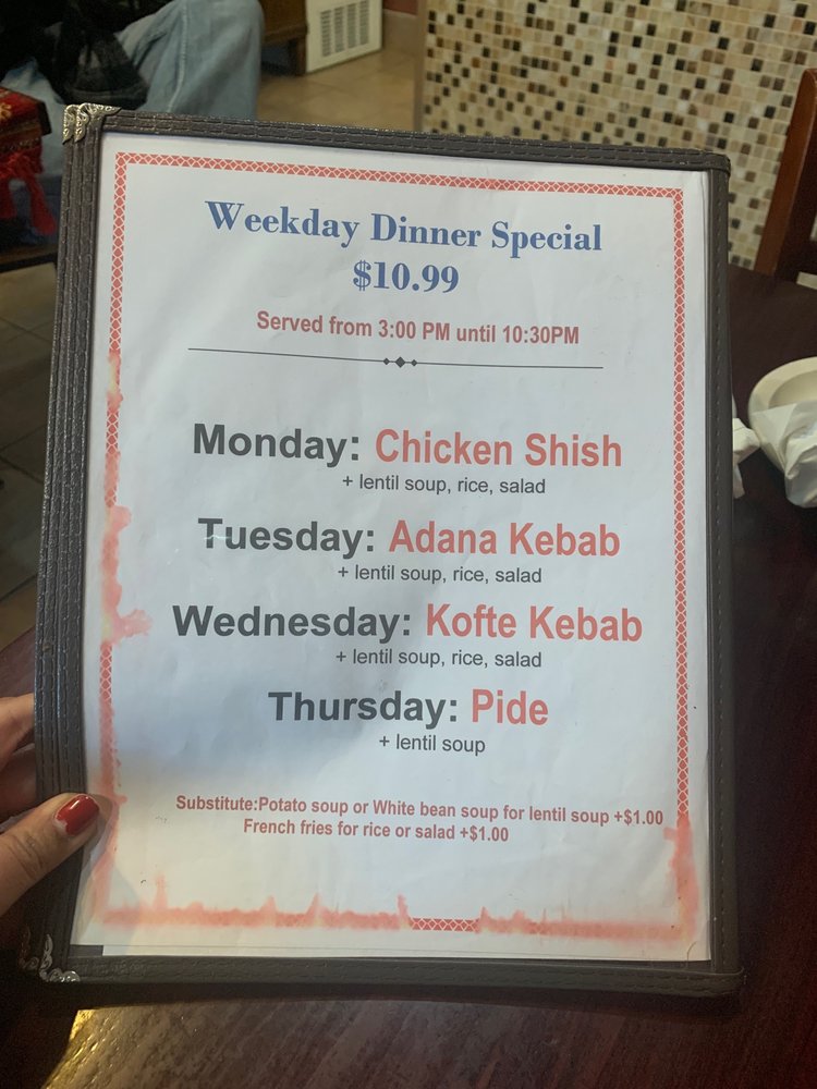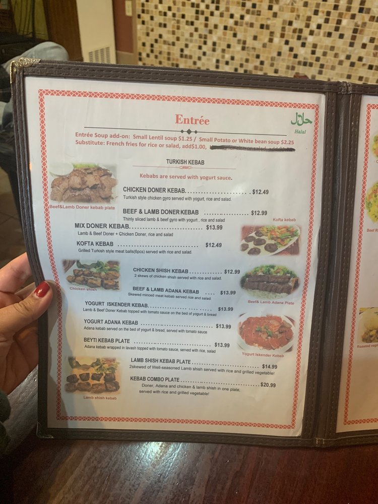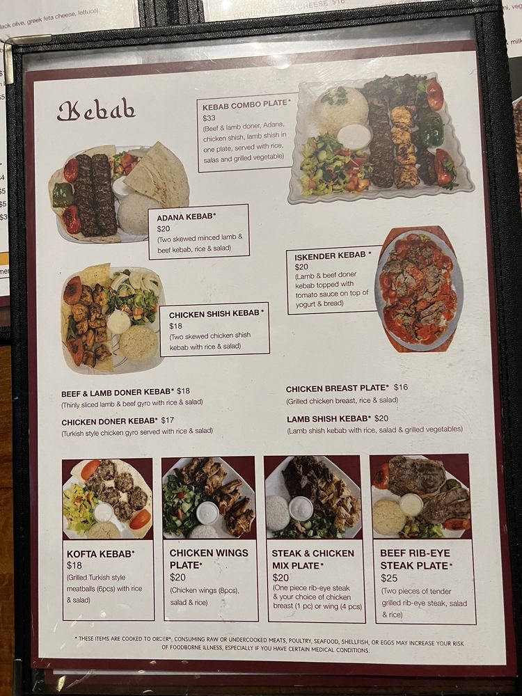 “ Ambiance is ok, but the kabobs are on point, kafta and chicken. As well the fruit juices, lahmacun, cheese pide (that bread though!). The kazandibi pudding is the best around. Staff works hard. Will definitely return for lunch again. ”