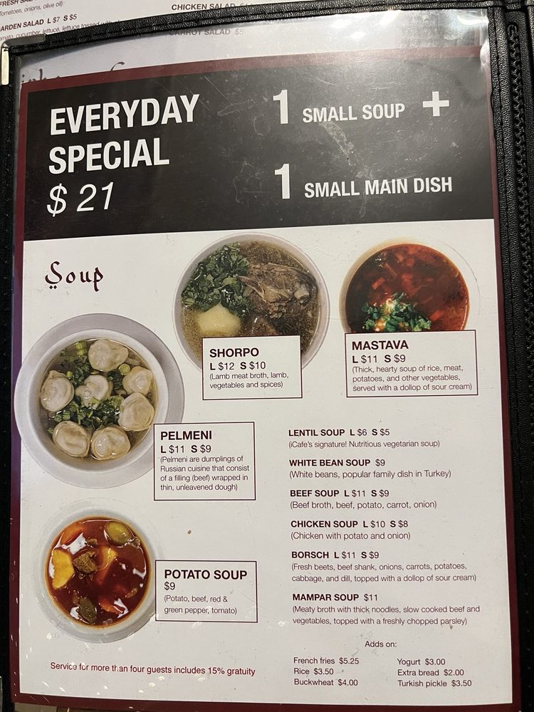 At iCafe Chicago, we celebrate a rich tapestry of flavors reflecting Central Asian and Mediterranean cuisine. Nestled on Irving Park Road, this Halal gem combines a welcoming ambiance with a vibrant menu, making it ideal for families and groups alike. From the tender RibEye Steak wraps to the unique kazandibi pudding, every dish is crafted with care. The restaurant excels in comfort food, with vegetarian options and hearty soups taking center stage. Customers rave about the incredible service and authenticity, showcased through specialties like Turkish coffee and kabobs. Join us for a delightful experience that caters to all.
